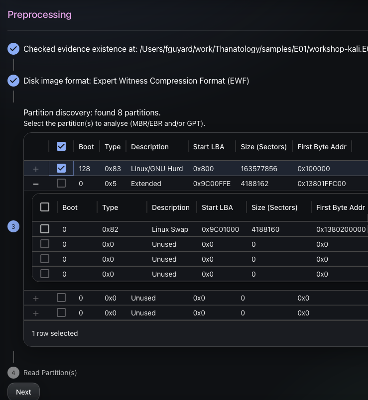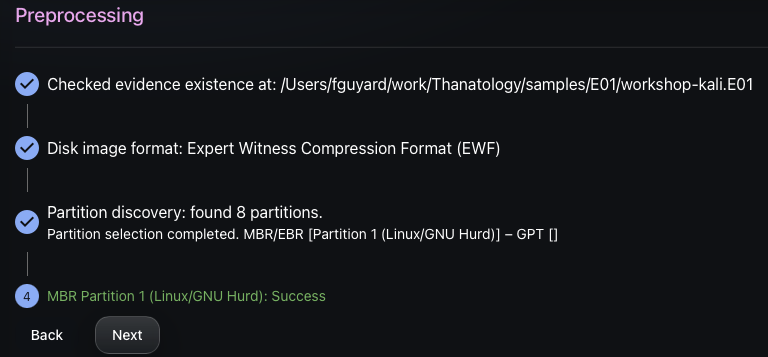 When choosing the partition to process by the Thanatology engine, the exhume_filesystem detection library is used to check if the targeted filesystem is supported.